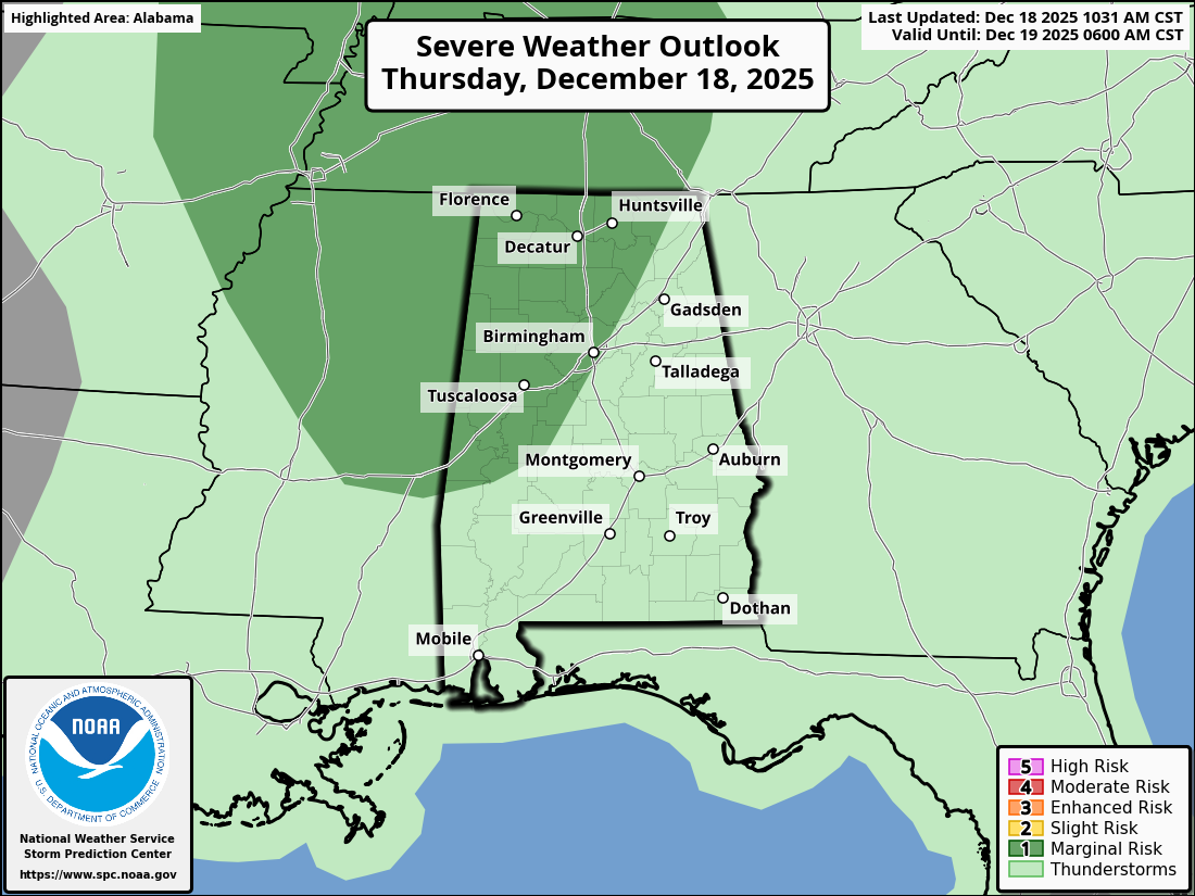 Today (December 18, 2025), there’s only a low (marginal) risk of severe thunderstorms in parts of the Mississippi, Tennessee, and lower Ohio Valleys, as well as coastal North Carolina.