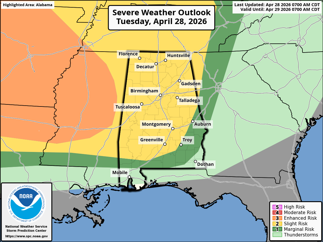 As the storm system pushes east and southeast, North Alabama is expected to remain on the southern edge of the broader severe setup today. While the highest-end tornado threat appears focused well to the north and northwest, North Alabama could still see strong to severe thunderstorms later this evening into the overnight hours, especially as storms move in from Tennessee and Mississippi.