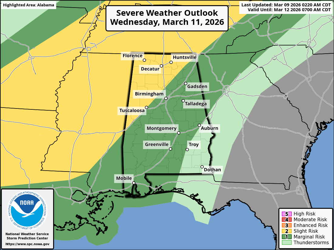 The National Weather Service has placed much of the region under a Slight Risk (Level 2 out of 5) for severe weather as a weather system moves east from Texas and the Mid-South toward the Southeast. Forecasters say warm, moist air already in place across Alabama will help fuel storm development as the system approaches.